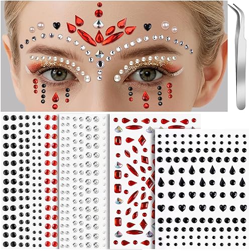 Teenitor 4 Sheets Face Gems Stick on, Face Jewels Red and Balck Face Rhinestones Gems, Festival Jewels Self-Adhesive Face Gems for Women, Rave Accessories for Face Eyes Body Halloween Makeup