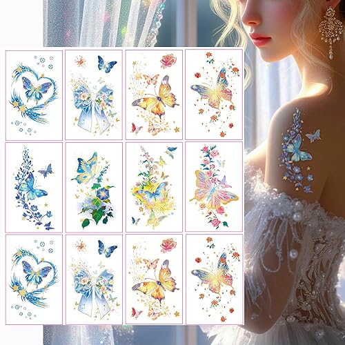 Wedding Glitter Butterfly Temporary Tattoos Sticker for Women Girls Decoration, Flash Fairy Body Art Shiny Butterflies Waterproof Fake Tattoos for Festival Party Eye Decor