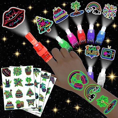 72 PCS Neon Party Favors – 48 PCS Luminous Tattoos & 24 PCS LED Finger Lights Combo – Birthday Goodie Bag Fillers, Party Supplies, Gifts Light Up Toys Glow In The Dark for Boys and Girls