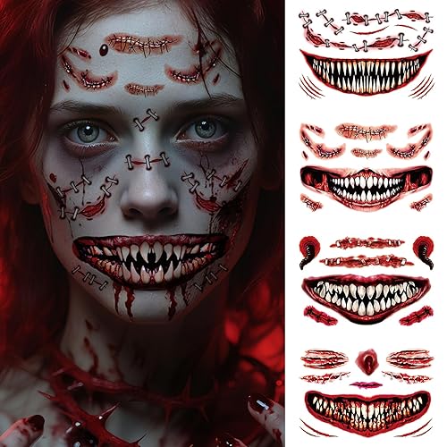 Cerlaza Halloween Decorations Temporary Tattoos, Scary Big Mouth Clown Halloween Costumes Accessories Party Favors, Fake Face Tattoos Zombie Makeup Kits, Clown Scars for Adult Women Men