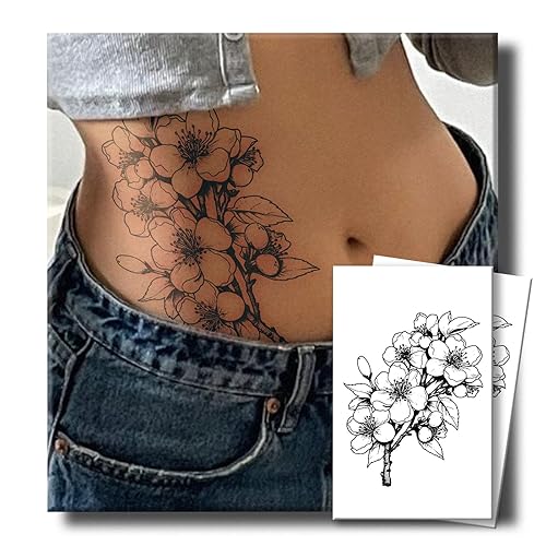 Semi Permanent Tattoo 2 Sheets | Cherry Blossom Design Lasts 2 Weeks, Waterproof & Realistic Tattoos for Women Arm Non-Reflective, Develops Fully in 48H
