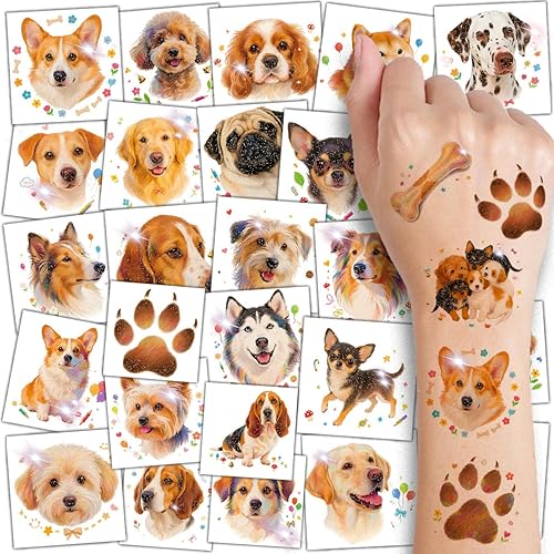 Glitter Dog Temporary Tattoos for Kids - 74 Individually Sheets | Waterproof & Easy Peel | Perfect for Kids Birthday Party Supplies, Dog Lovers, School Rewards