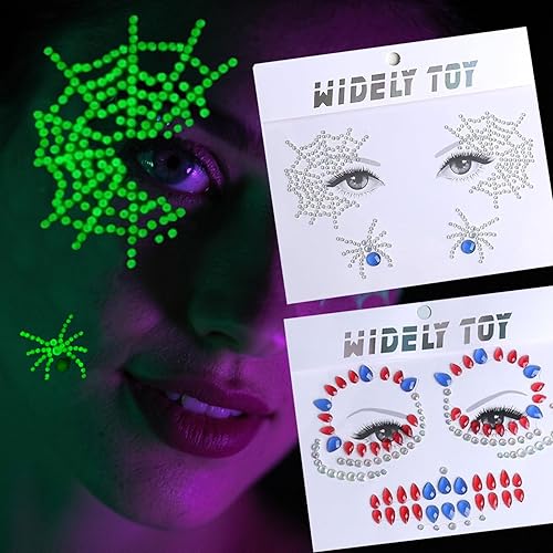 2 Pack GLOW IN THE DARK Face Gems for Halloween - Spider & Skull Rhinestone Stickers - Self-Adhesive Diamond Face Jewels for Costume Party, Rave, Festival – Flash Light Activated Body Glitter