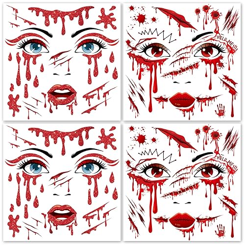 HOWAF 4 Sheets Halloween Scary Face Tattoos, Halloween Bloody Scar Tattoos Sticker for Hallows' Eve Costume Vampire Masquerade Scary Party Women Men, Halloween Zombie Temporary Tattoo