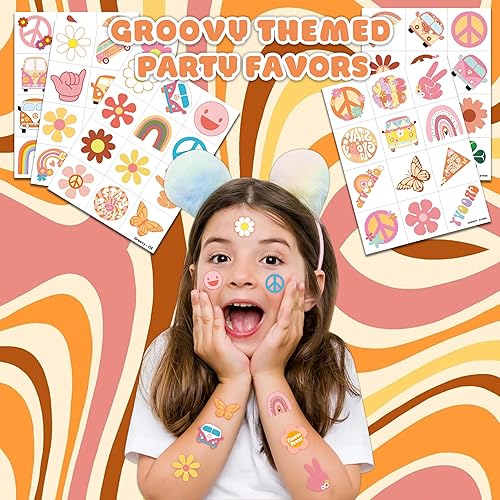 60PCS One Two Groovy 60s 70s Pre-Cut Temporary Tattoos for Kids Birthday Theme Party Supplies Decorations Favors Decor Super Cute Retro Hippie Rainbow Tattoo Stickers Gift for School Prizes Girls Boys