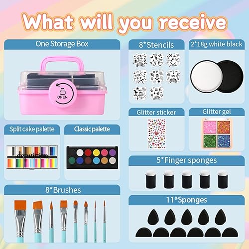 Professional Face Painting kit for Kids Adult Face Painter Depvision 68 Colors Split Cake Face Paint Kit, Non-Toxic Washable Safe Water Based with Brushes Stencils Sponge Gems Glitter for Halloween