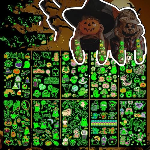 10 Sheets Halloween Party Tattoos Temporary Decorations Glow in The Dark Luminous Face Body Waterproof Temporary Tattoos Stickers Skeleton Pumpkin Bat and Ghost Halloween Tattoo Stickers
