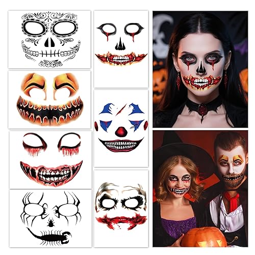 HOWAF 7 Sheets Halloween Clown Face Tattoos Day of the Dead Face Tattoos Stickers for Hallows' Eve Costume Vampire Masquerade Scary Party Women Men Dia De Los Muertos Costume Supplies