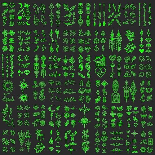 Luminous Temporary Tattoos for Adults, 60 Sheets Glow In The Dark Fake Tattoos for Face Hands, Lines Flowers Stars Moon Bohemian Design