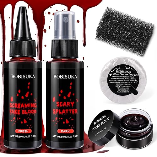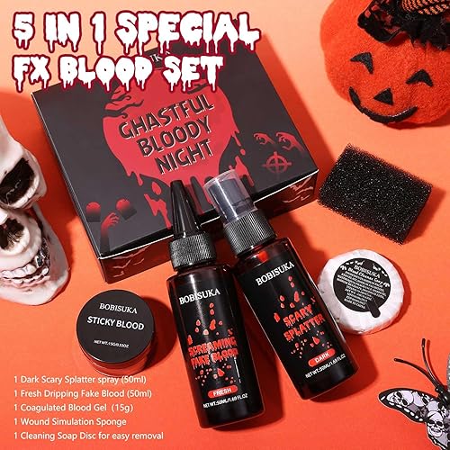 BOBISUKA 5PCS Halloween Fake Blood Kit – Dripping Fresh Blood, Dark Spray Blood, Coagulated Gel, Cleansing Soap, Stipple Sponge – Realistic Washable SFX Makeup for Zombie, Vampire Monster & Cosplay