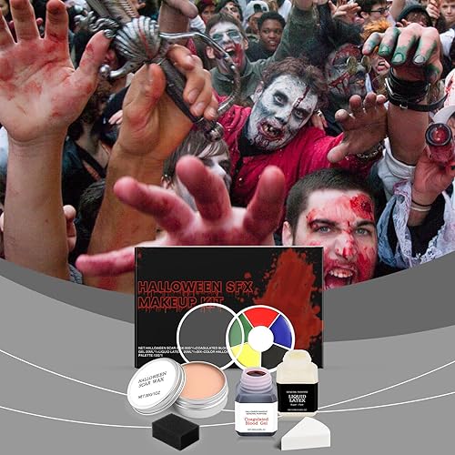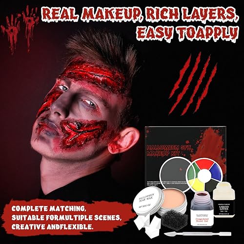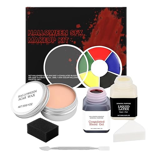 Halloween Scar Makeup, FX Makeup Kit with 5 Color Bruise Wheel Face Body Paint Stage Blood Coagulated Blood Gel and Spatula Sponges, Scar Wax, Liquid Latex for Special Effects Halloween