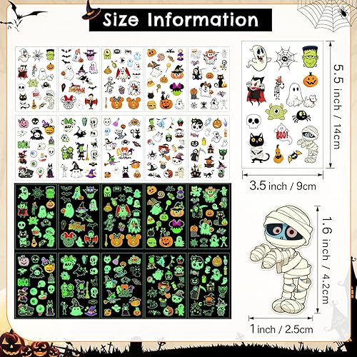 160pcs Halloween Temporary Tattoos for Kids, Glow in the Dark Tattoos Waterproof Luminous Tattoo Stickers Pumpkin Skeleton Witch Designs for Boys Girls Halloween Goodie Bag Fillers Party Favors