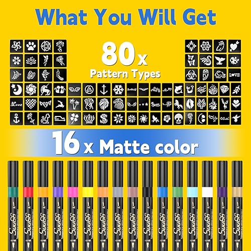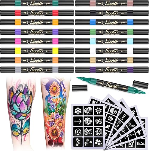 Temporary Tattoo Markers Kit, Dual-End 16 Colors with 80 Stencils for Body Art | Skin-Safe, Washable, Cosmetic-Grade | for Kids & Adults