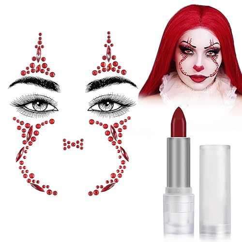 Clown Face Jewels, Halloween Face Jewels for Women Halloween Face jewels Include Rhinestone Crystals Stickers Red Face Paint Stick for halloween Festival Rave Party Festival Decorations
