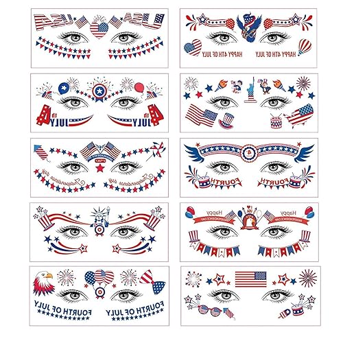 10 Sheets Fourth of July Face Temporary Tattoo Stickers Independence Day Face Tattoo Makeup Tattoo Stickers for Women Face Eyes Decoration Supplies