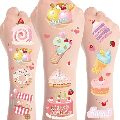 8 Sheets Sweet Sassy and Seven Birthday Decorations 200+ Sweet Donut Temporary Tattoos Ice Cream Doughnut Stickers Happy 7th Birthday Theme Temporary Tattoos Party Favors Supplies Prizes Rewards