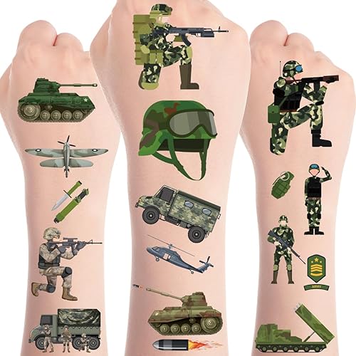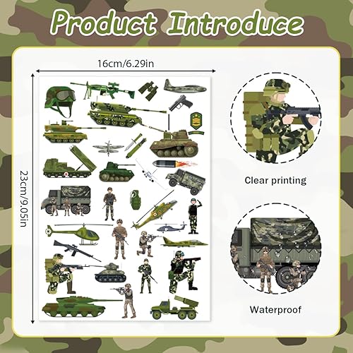 8 Sheets Army Birthday Decorations 200+ Army Temporary Tattoos Military Stickers Camo Theme Party Soldier Helicopter Tank Truck Temporary Tattoos Party Favors Supplies Prizes Rewards