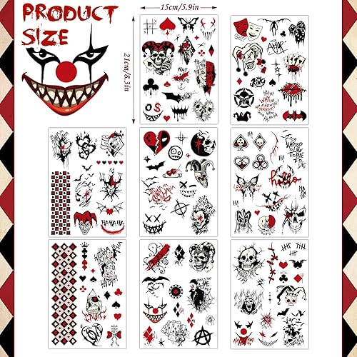 Konsait 8 Sheet Large Halloween Temporary Tattoos, Fake Clown Face Tattoo for Adult Kids Halloween Party Favor Black White and Red Clown Makeup Tattoos Cosplay Accessories