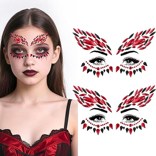 Halloween Face Gems Rhinestones Black Red Face Jewels Stickers Crystal Body Eye Temporary Tattoo for Women Makeup Party Costume Cosplay Accessories 2Pcs