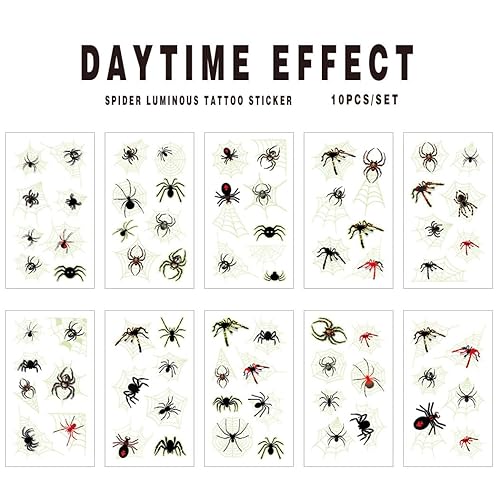 10PCS Halloween Spider Temporary Tattoos Noctilucence Spider Silk Scary Prank Insect Fake Tattoos Witch Makeup for Women Men Kids Cosplay Party