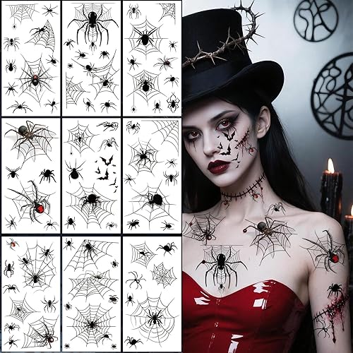 10 Sheets Scary Halloween Fake Tattoos - Fake Spider Decals Realistic Large 3D Spider Web Temporary Tattoos Makeup Kit For Women Adults, SpiderWeb Bat Fake Face Tattoos Sticker For Kids Men Adults