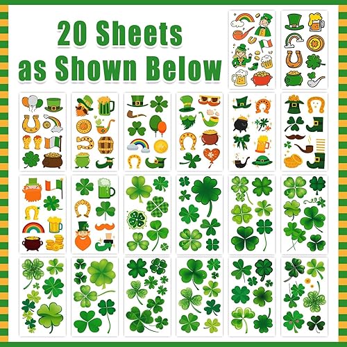 Partywind 20 Sheets St Patrick's Day Tattoos for Kids, 156 Styles Saint Patrick's Day Irish Decorations Accessories, Shamrock Tattoos Stickers Party Supplies for Green Day Party Games