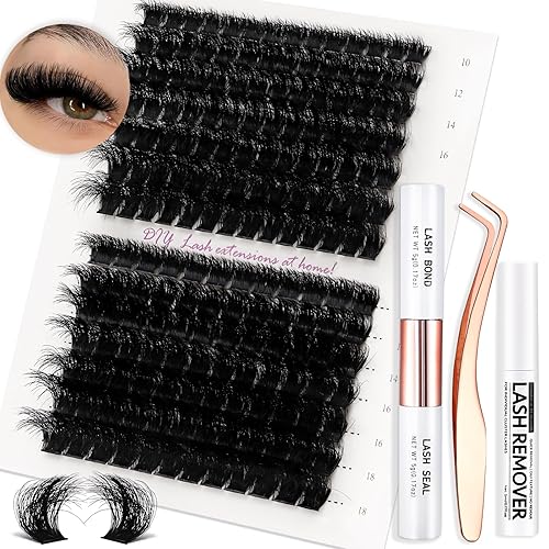 Fluffy Lash Extension Kit 182Pcs Thick Eyelash Extension Kit 10-18mm Volume Cluster Lashes Set with Bond and Seal Tweezers Cluster Remover (150D&200D Kit)