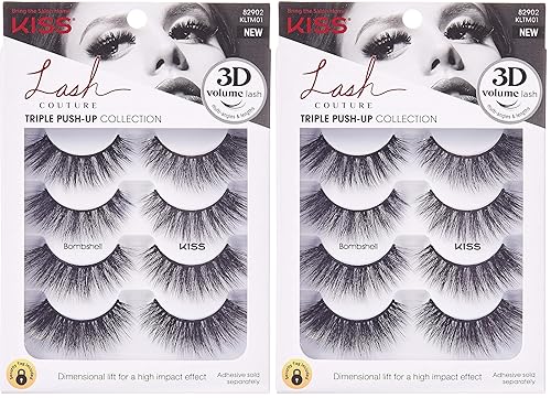 KISS Lash Couture Triple Push-Up False Eyelashes, Bombshell', 14 mm, Includes 4 Pairs Of Lashes, Contact Lens Friendly, Easy to Apply, Reusable Strip Lashes (Pack of 2)