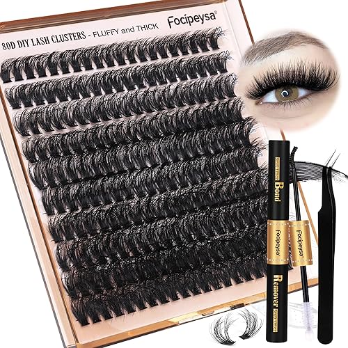 Focipeysa Volume Lash Clusters Kit D Curl Lashes Extensions Thick Volume Eyelash Clusters DIY Eyelash Extension with Lash Glue Lash Bond and Seal 10-16mm Fluffy Cluster Eyelash Extension DIY Lashes
