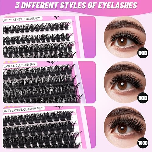 728Pcs Fluffy Lashes Cluster Kit Extensions Eyelash Kit with Bond&Seal 60D+80D+100D Thick Volume Eyelash Clusters Kit D Curl Volume False Eyelashes DIY Individual Wispy Fake Eye Lashes Combo