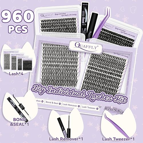 Lash Extension Kit 960Pcs D Curl Individual Lashes Kit Includes 4 styles of Lash Bond and Seal Remover and Tweezers (10-18MM-30+40+60+80D)