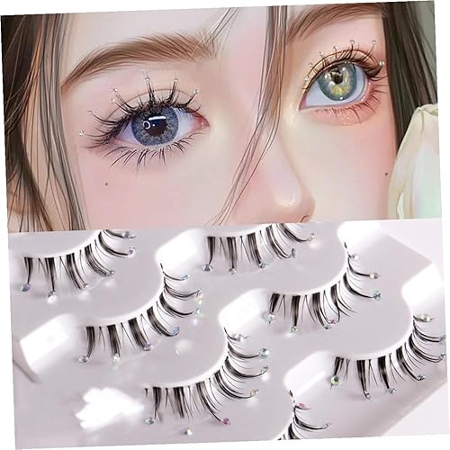 PartyKindom 5 Pairs Natural False Eyelashes with Rhinestones Decorative Diamond Accents Long Voluminous Press Lashes for Parties Cosplay Halloween Christmas Beginner Friendly