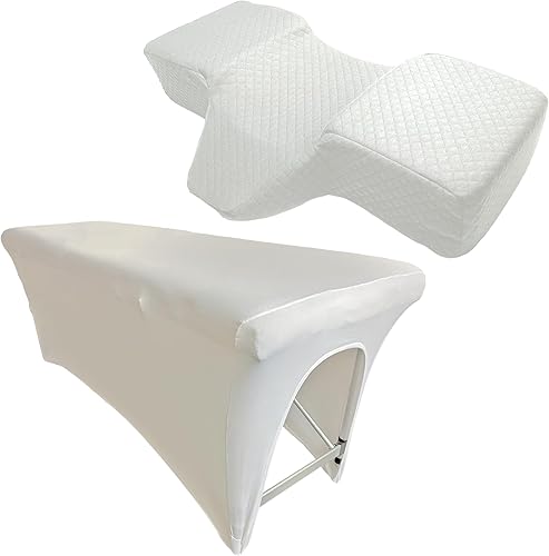 | Lash Bed Cover + Pillow (White) | Spa Bed Cover for Lash Extension Bed | Curved Lash Bed Pillow with Neck and Back Support