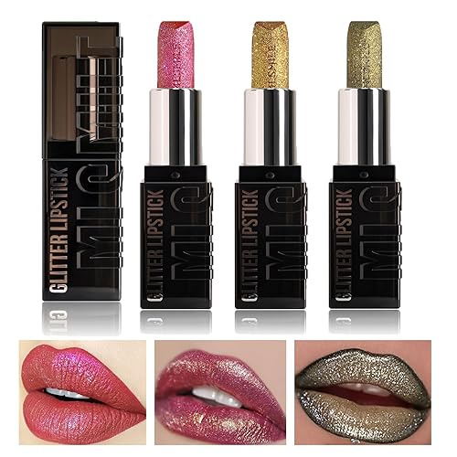 Dulele 3 Colors Glitter Lipstick Set, High Shine Diamond Shimmer Lipstick,Metallic Sparkly Finish Lip Stick, Rose Color Shiny Lipstick for Women Lips Makeup(B)