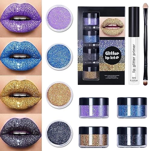 Kawaii Kisses Glitter Lip Kit, 2025 Anamakeup Kawaii Kisses Glitter Lip Kit, Animakeup 4 Colors Stay Golden Cosmetics Glitter Lip Kit with Lip Primer and Brush (Cold Color, one size)
