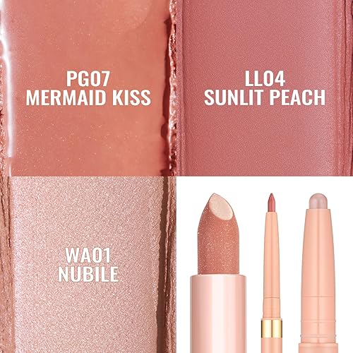 Oulac Lip & Eye Makeup Set 3PCS Included Shimmer Lipstick, Lipliner, Eyeshadow, Gift Lipstick for Women, PG07+WA01+LL04