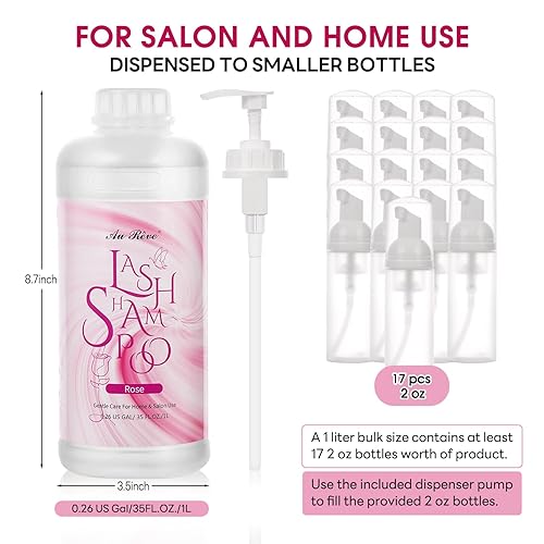 Lash Shampoo for Lash Extensions 1L/35fl.oz Eyelash Extension Cleanser Lash Cleaning Kit, Gentle Foaming Eyelash Shampoo with Brush and Wash Bottle for Salon Home Care Rose