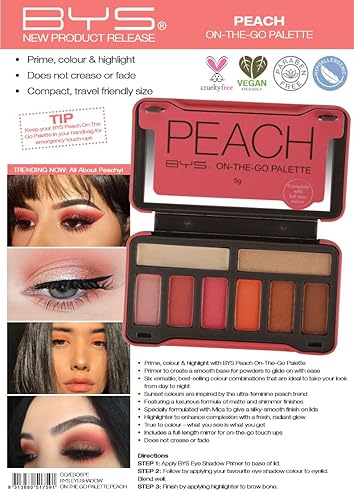BYS On-The-Go Peach Eyeshadow Palette with Primer Highlighter and Mirror, 6 Eyeshadows, 1 Highlight, 1 Prime