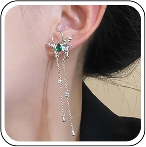 Vintage Emerald Butterfly Earrings Silver Chain Tassel Drop Earrings Butterfly Emerald Stud Earings Long Cz Chain Earrings Jewelry for Women
