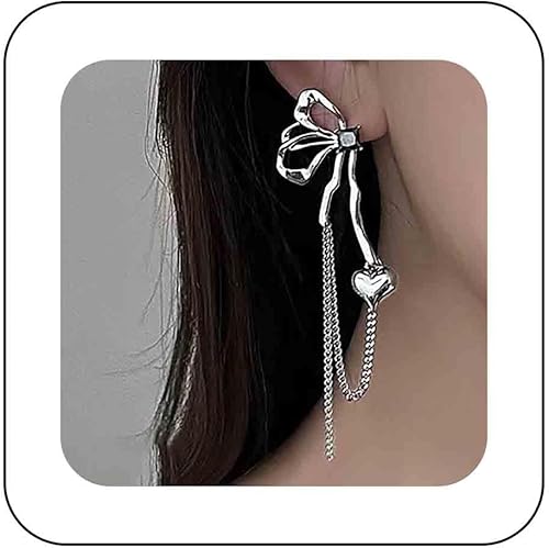 Vintage Crystal Bow Chain Drop Earrings Rhinestone Heart Stud Earrings Silver Long Chain Tassel Earrings Sparkly Cz Bridal Earrings Jewelry for Women