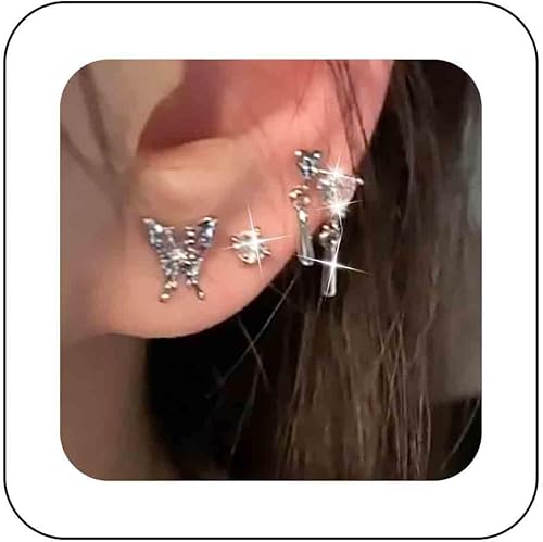 Vintage Crystal Butterfly Stud Earrings Sets Cz Heart Stud Earrings Silver Hollow Butterfly Earrings Tiny Rhinestone Heart Earrings Jewelry for Women