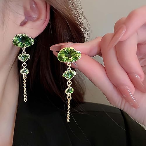 Vintage Green Lotus Leaf Earrings Lotus Leaf Drop Earrings Gold Long Leaf Tassel Earrings Green Flower Stud Earrings Jewelry for Women