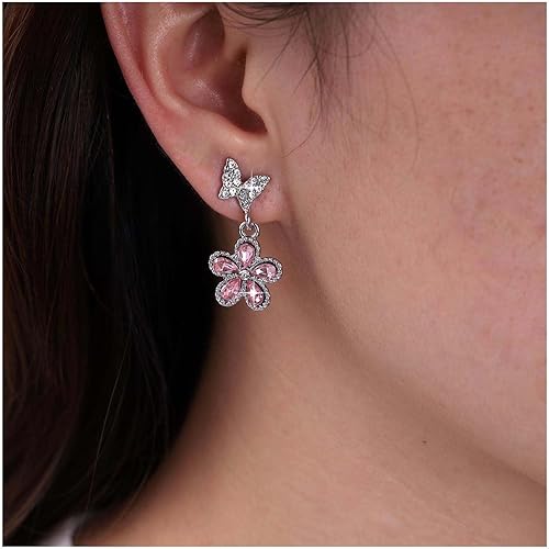 Vintage Pink Crystal Flower Earrings Butterfly Flower Drop Earrings Silver Rhinestone Butterfly Stud Earrings Pink Gemstone Butterfly Earrings Jewelry for Women