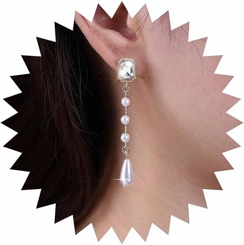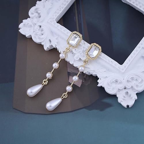 Vintage Crystal Pearl Dangle Earrings Teardrop Pearl Drop Earrings Long Tassel Pearl Earrings Gold Cz Square Stud Earrings Jewelry for Women