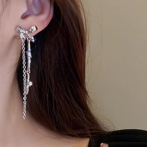 Vintage Bow Crystal Drop Earrings Silver Bar Dangle Earrings Long Crystal Bow Chain Earrings Cz Tassel Chain Earrings Jewelry for Women
