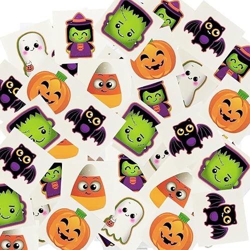 Halloween Temporary Tattoos 2" Inches - This set of Halloween tattoos for kids features over 1200 fun and spooky designs including pumpkins, ghosts, witches, bats, skeletons, spiders, mummies, and more! With kid-friendly and cartoon-style Halloween tattoos, children can safely enjoy decorating their hands, arms, and faces for any spooky celebration. These Halloween temporary tattoos are perfect for adding excitement to trick-or-treating, school parties, or as cute Halloween decorations on goody bags and party favors.