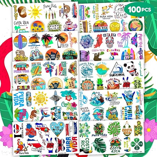 100PCS Costa Rica Pura Vida Temporary Tattoos Birthday Party Decorations Favors Supplies Summer Tropical Beach Tattoo Stickers Gifts For Kids Boys Girls School Rewards Prizes Carnival