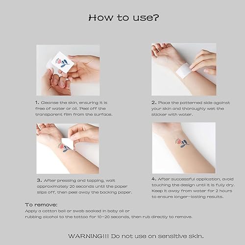 【Safe and Easy to Use】: These tattoos are made from safe, non-toxic materials. First, clean the skin, then apply the design face-down onto the skin. Moisten with a towel, wait 20–30 seconds, and peel off the backing paper to reveal your body sticker! They can be easily removed with alcohol or baby oil.