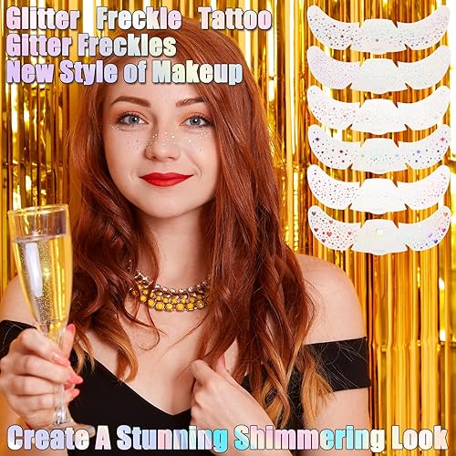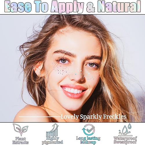 Effortless Application: Apply face glitter for women easily: Peel, place on clean skin, press 40-60 secs with wet sponge! These simple temporary tattoos transfer instantly. Achieve perfect glitter freckle patterns fast, no mess.