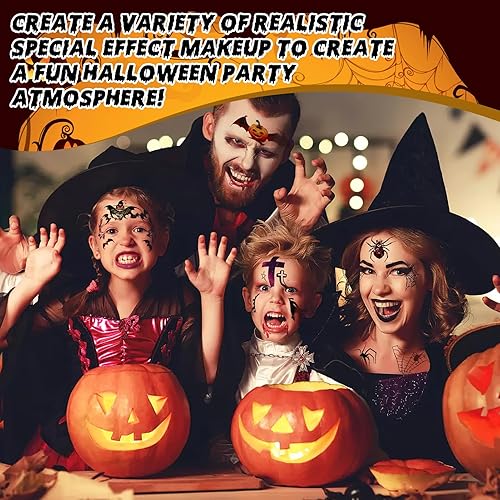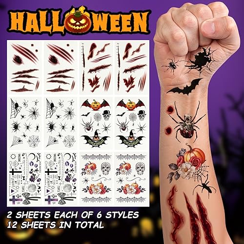 【Diverse and Realistic】Each set of Halloween makeup kit has 12 Sheets(4.72x7.48 inch), a variety of images, stitched scars, wounds, blood, Spiders, bats. funny Halloween zombie temp tattoos that can be freely combined to make sure your makeup at the Halloween party is the best idea